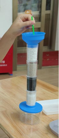 課堂上,老師引導(dǎo)家長和孩子共同進(jìn)行污水過濾小實驗。孩子們自己動手,將污水倒入裝有花崗巖石子、瓷砂、活性炭、石英砂的試管,觀察水由渾濁變?yōu)榍宄旱倪^程,了解污水過濾的原理,從而啟發(fā)孩子保護(hù)水資源、保護(hù)環(huán)境的意識,引導(dǎo)他們成為生態(tài)文明理念的傳播者和實踐者。