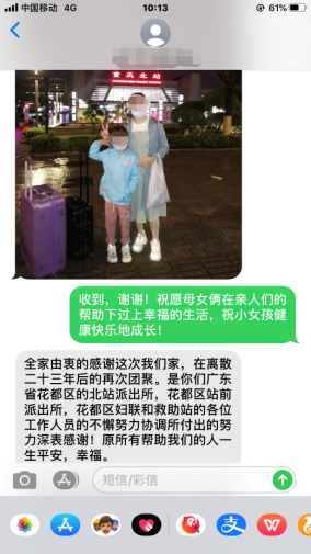 3月21日,花都區(qū)婦聯(lián)工作人員收到了張先生的感謝短信,照片中小麗母女站在了重慶北站廣場前,雖然戴著口罩,但是難掩兩人眼中的笑意。張先生也代表家人對派出所、婦聯(lián)和救助站的傾力幫助表示衷心感謝,讓離散23年的家人再次團(tuán)聚。花都區(qū)婦聯(lián)工作人員也提出了相關(guān)建議,希望張先生家人給予小麗母女多一些支持和關(guān)懷,發(fā)生矛盾糾紛要以溝通為主,多傾聽當(dāng)事人的心聲,并且盡快協(xié)助小麗母女辦理戶籍手續(xù),讓小麗擺脫“黑戶”身份,也能讓小女孩正常接受義務(wù)教育,健康快樂地成長!